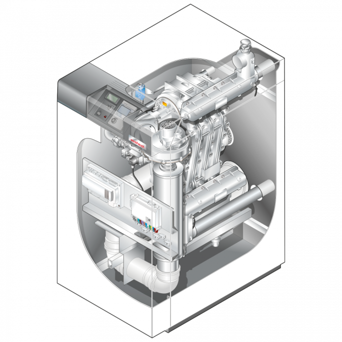 Betriebsgeräusche werden durch den integrierten Ansaug-Geräuschdämpfer (bis 210 kW) wirksam reduziert.