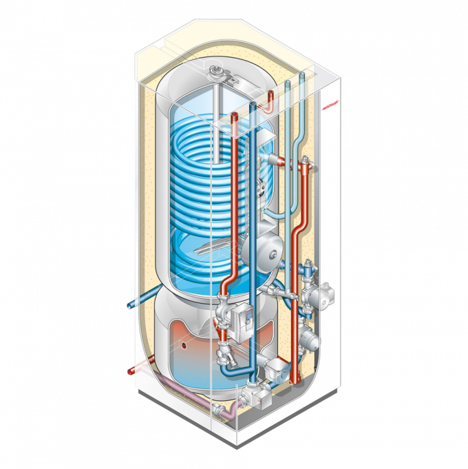 Der Kombispeicher vereint alle Komponenten, die für die Verbindung der Wärmepumpe mit dem Heizkreis erforderlich sind, in einem kompakten Gehäuse. Damit wird der Installations- und Montageaufwand erheblich verringert. Er enthält einen 300 Liter Trinkwasserspeicher, einen 100 Liter Pufferspeicher, Hydraulikkomponenten, Umwälz- und Zirkulationspumpe sowie eine elektrische Zusatzheizung. Der Kombispeicher ist für die Kombination mit einer Großzahl der Weishaupt Wärmepumpen ausgelegt.