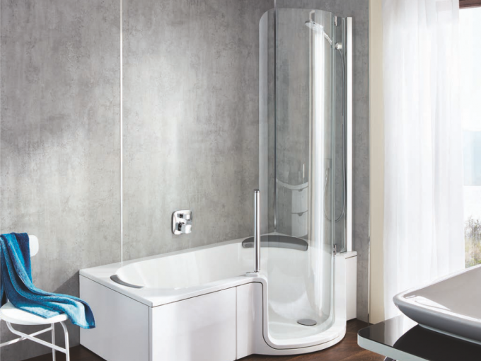 Das raffinierte Design mit der Tür macht‘s möglich: Bequem ein- und aussteigen wie in eine Dusche. Mehr Bewegungsfreiheit durch die gerundete Wannenform. Die gerundete Sicherheitsglas-Duschtür sorgt für Spritzschutz und zuverlässige Dichtheit. Zusätzlich bietet die TWINLINE 1 jede Menge Komfort. Dank der integrierten Nackenstütze können Sie sich beim Baden völlig entspannt zurücklehnen. Ein in den Wannenrand integrierter Sitz ermöglicht Körperpflege der bequemeren Art.