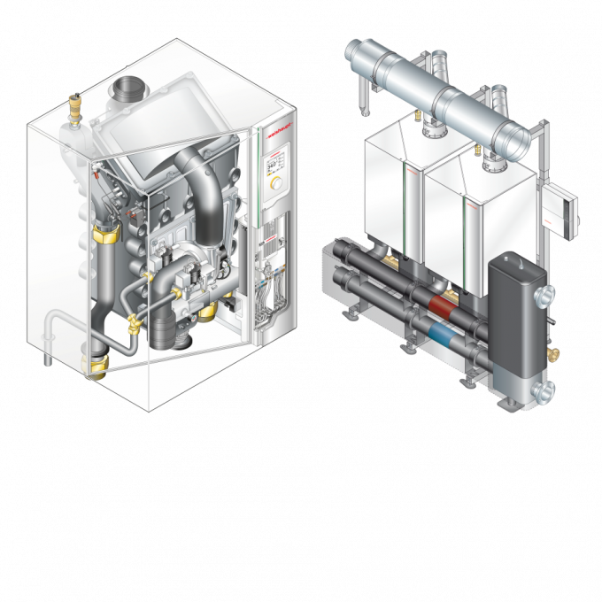 Die Wandmontage spart Platz und durch die vielen Abgaskomponenten kann die Geräteanordnung flexibel erfolgen. Bei Kaskadierung von bis zu 8 Geräten auf 800 kW können verschieden Anordnungen (in einer Linie, über Ecke oder auch Rücken an Rücken), je nach örtlichen Gegebenheiten erfolgen.